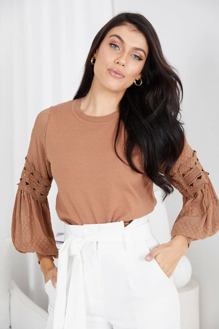 Our Tia Top comes in a brown camel tone. It features a round neckline, long relaxed sleeves, and an embroidered pattern on the sleeves. This versatile top is perfect for casual outings with the girls, or taking on the day in the office!
