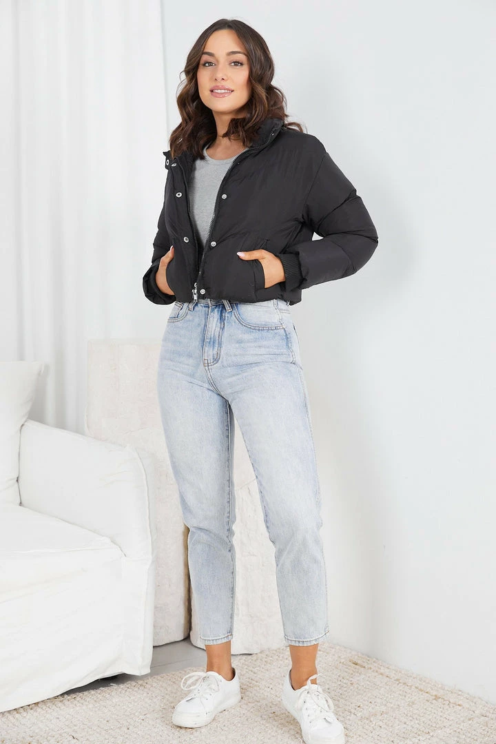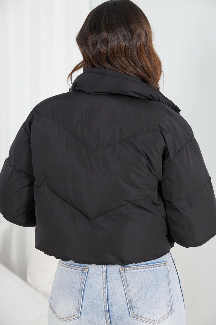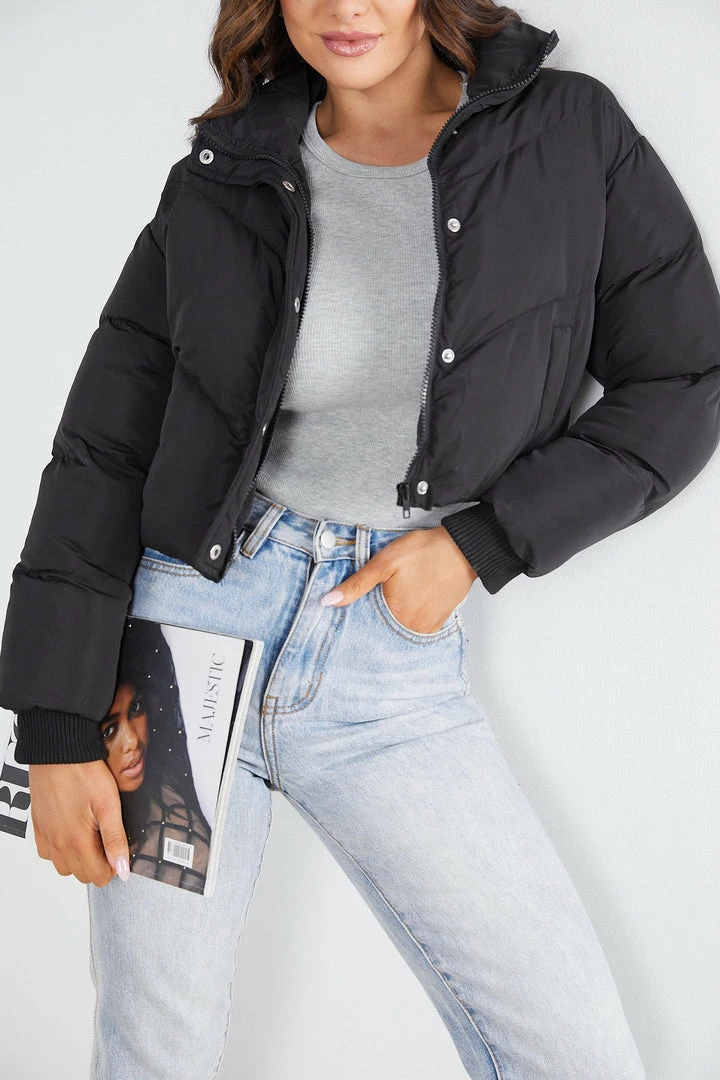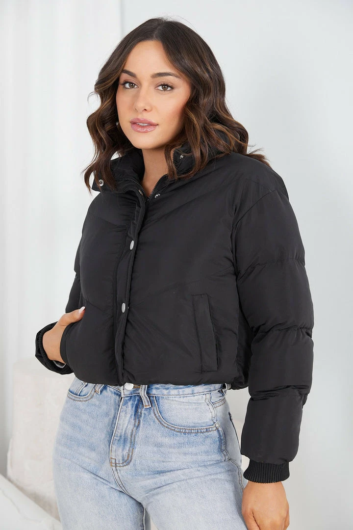Our Vylet Puffer Jacket comes in a classy black colour. An eye-popping winter closet addition, this puffer features a standing mock collar, snap buttons and concealed zip fastening from neck to hem, long sleeves with ribbed cuffs and angled welt pockets on the sides. Grab your comfiest pair of pants & chelsea boots and you’re ready to take on the cold day!