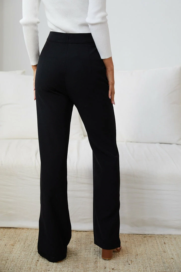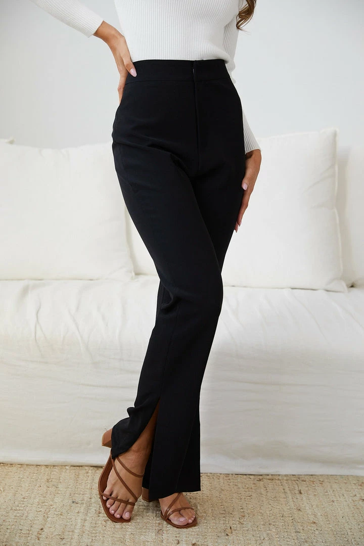 Our Cairose Pants come in a coal black colour. The right cut of flare that truly flatters is here with these pants that feature a waist band, front zipper, hook closure, ankle length hem and side slit. Wear it to work on weekdays with a shirt and change to a sexy cropped top for drinks with your friends at night!