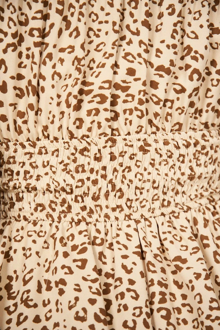 Our Laudine Playsuit comes in a beige and black leopard print. It features an off the shoulder neckline and long bishop sleeves for a relaxed, comfortable fit. This cute playsuit pairs beautifully with heels or boots for a stunning transseasonal look!