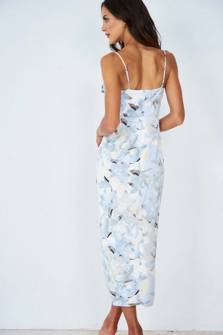 Our Jaynie Dress comes in a fresh white tone base, with a blue & grey tone floral print. It’s a sleeveless midi that features spaghetti straps, a square neckline & a side split in the skirt. This flowy midi is the perfect dress for warm spring months!