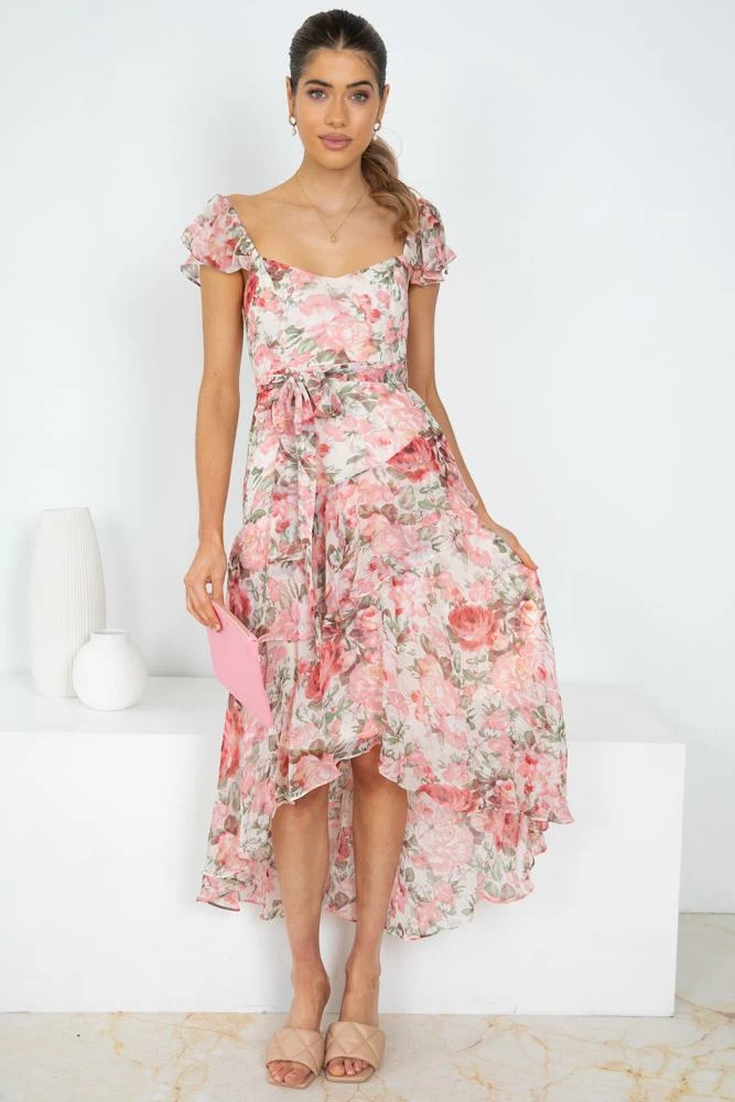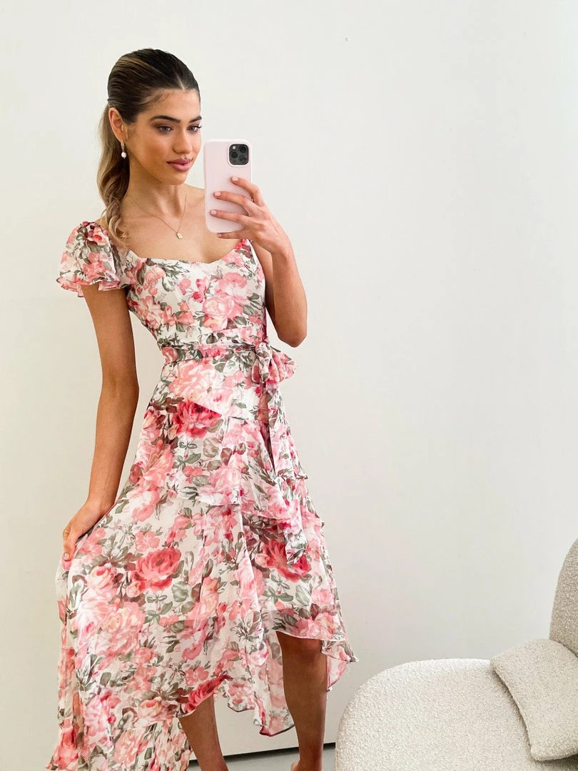 Our Fluttering Dress is a feminine dream. This stunning maxi comes in a pink base featuring a pink, sage & red toned floral print. The soft V neckline, flutter sleeves, adjustable fabric waist tie, and high low hemline are beautiful additions to this piece. Pair with your favourite nude strappy heels for an effortless and dreamy look.