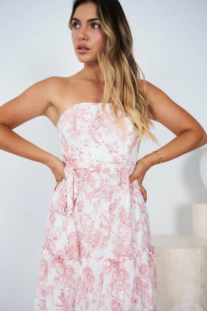 Our Kathleen Dress comes in a white tone base, with a pink tone print. It’s a sleeveless midi that features a strapless neckline for a relaxed, comfortable fit. This flowy midi pairs beautifully with heels for a stunning seasonal look!