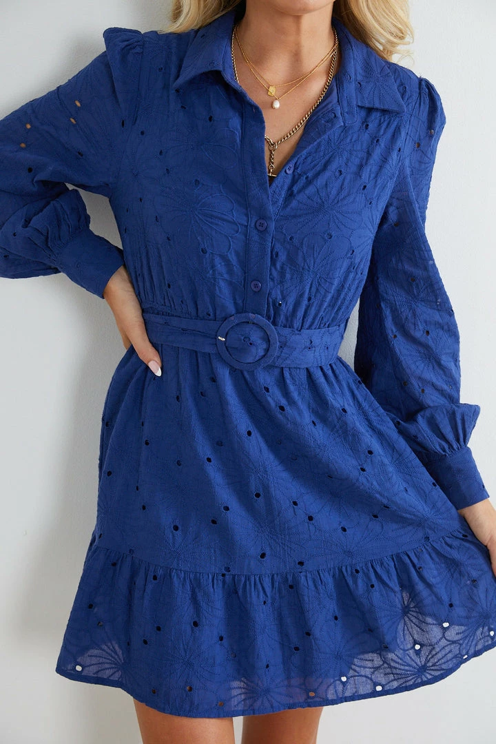 Our Lyka Dress comes in a navy blue tone color. This features classic collars, buttons down the front, long sleeves with button cuffs. Paired with your favourite nude heels, this piece is perfect for any formal occasion or even brunch with the girls!