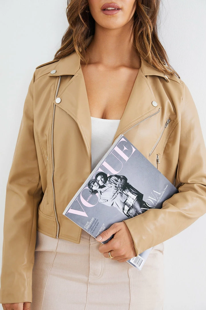 Our Sarai Jacket comes in a neutral camel colour. A stylish piece to add to your outerwears, this long sleeved jacket features a collar and lapel with fasteners, zipper pockets, zipper fastening on the front and epaulet on the shoulders for an added edgy touch. Pair with leather boots and jeans for a biker chic look.