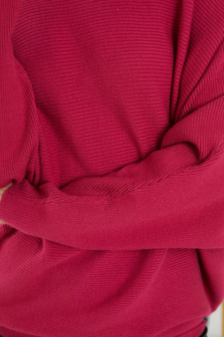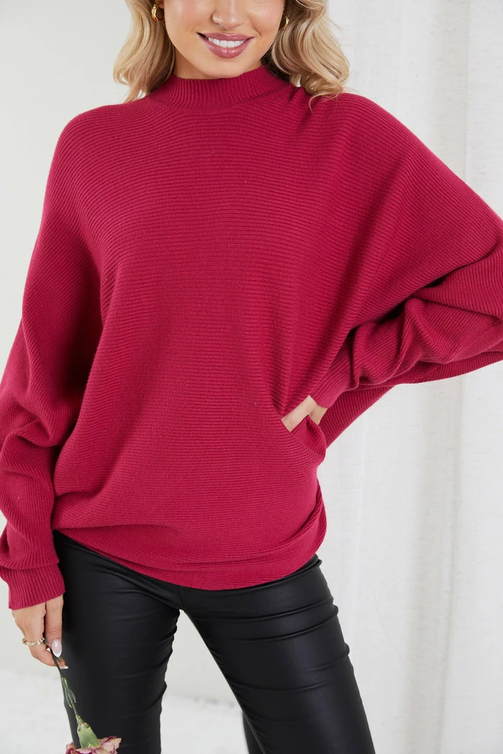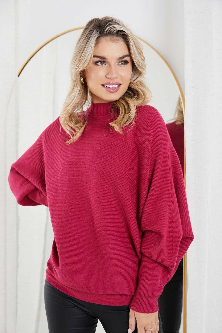 Our Baara Knit comes in a fun pink colour. Make a power statement in style and comfort in this batwinged top that features a high round neckline, long sleeves and a loose fit on the bodice. It pairs beautifully with skinny jeans and flat boots.
