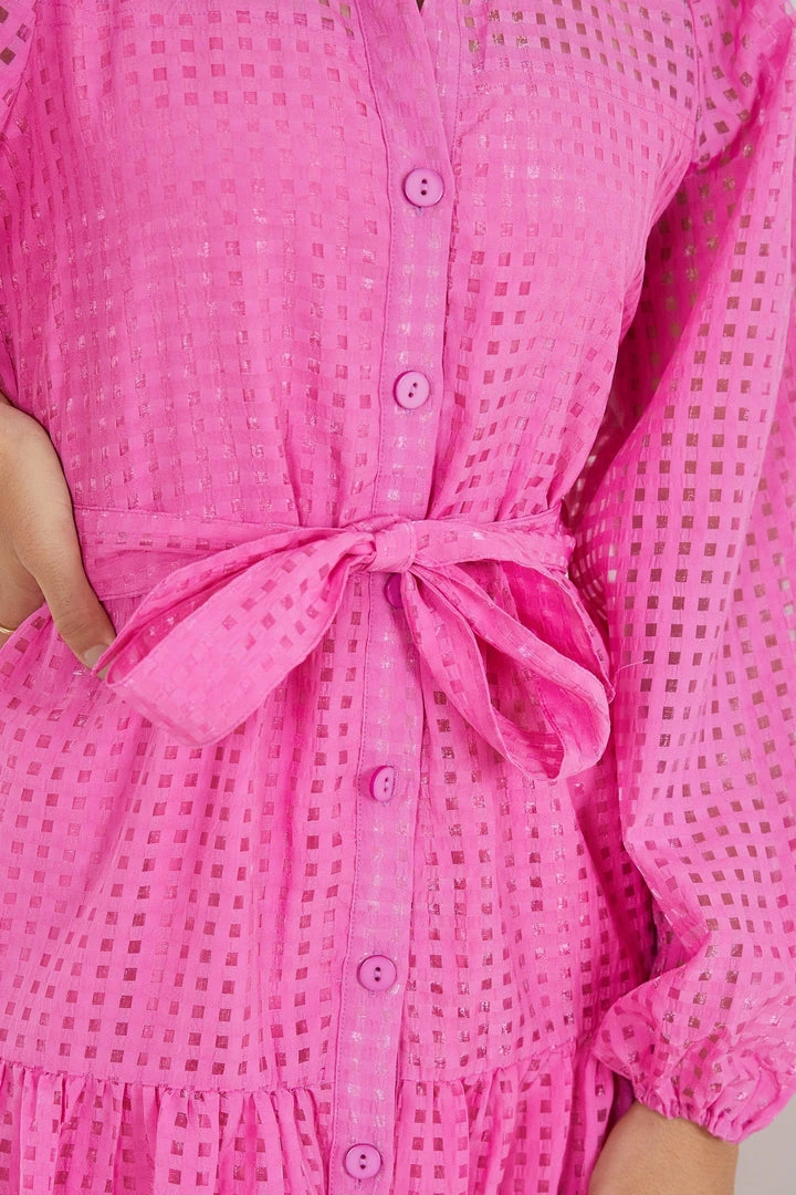 Our Notepad Dress comes in a gorgeous pink tone in a medium weight, relaxed fit midi length. The v neckline, classic collar, long sleeves, tiered skirt and buttons down the front are fab additions to this midi that you’re sure to love as the weather begins to cool.