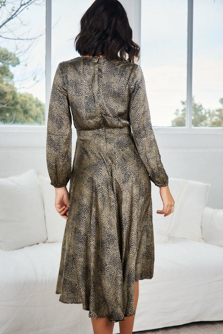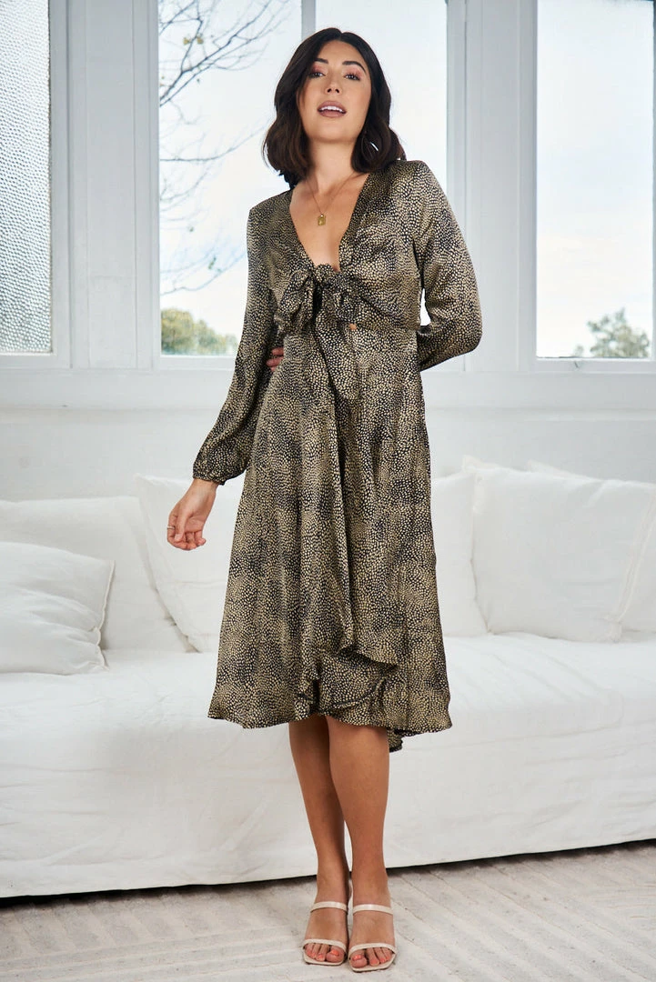 Our best-selling Bryleigh Dress is back in a demure and sophisticated olive shade with ink-black print. It’s a gorgeous medium-weight material in a sheen fabric that suggests elegance and poise. The deep v neckline with bust ties is a chic feature with long bishop sleeves that float as your arms move. This standout dress is a relaxed fit with a cinched waist to highlight your gorgeous figure in all the best ways.