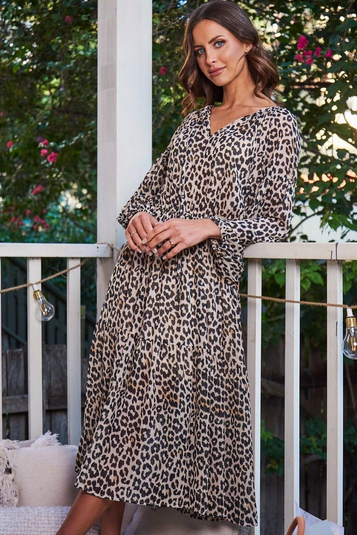 Our Rowena Dress comes in a striking leopard print. It features a v neckline, long bishop sleeves, and a fabric waist tie to cinch in the figure beautifully. This stunning midi pair beautifully with boots or heels for an effortless transseasonal look!