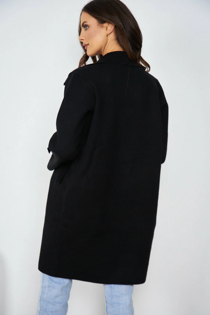 open-style coat comes in a deep black tone. Featuring faux button details on the cuffs and on the front, and pockets. Pair with your favourite pair of relaxed pants for a classy winter look!
