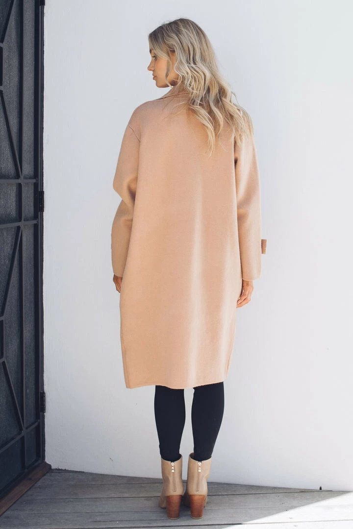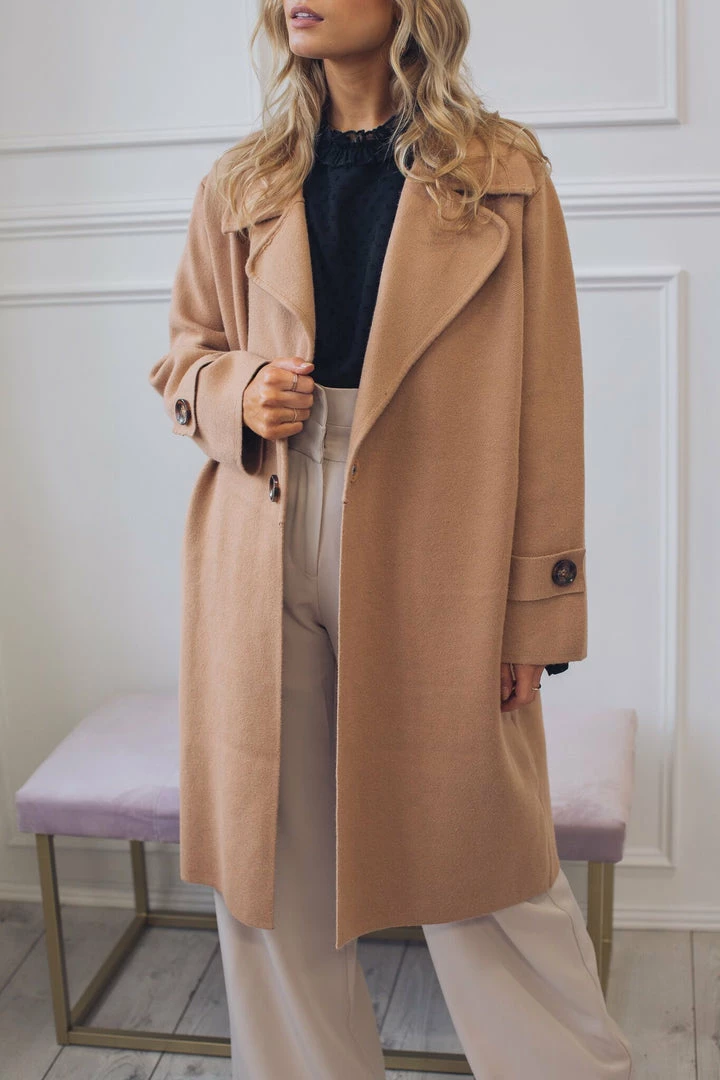 open-style coat comes in a neutral camel tone. Featuring faux button details on the cuffs and on the front, and pockets. Pair with your favourite pair of relaxed pants for a classy winter look!