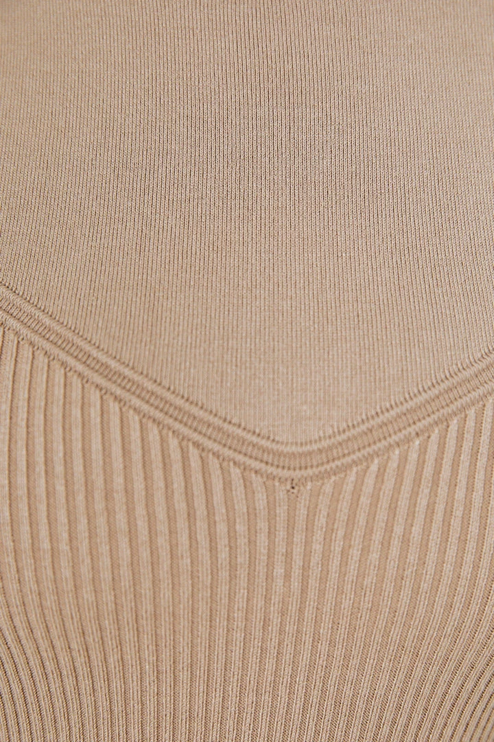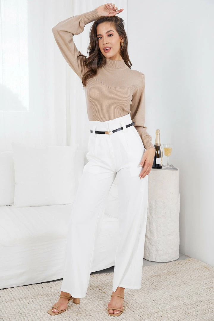 Our Jericha Knit Top comes in a coffee latte colour. A piece to embellish your autumn wardrobe, this knit blouse features a high neckline, long ribbed cuff sleeves and a fun combination of flat fabric on the yoke up to the wrist and textured rib patterns on the collar and bodice. Glam up with a tea length electric pleated skirt and slingback heels.