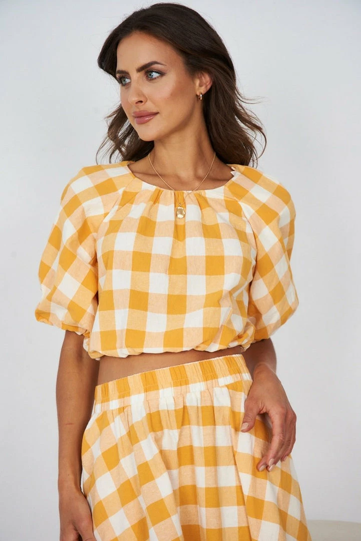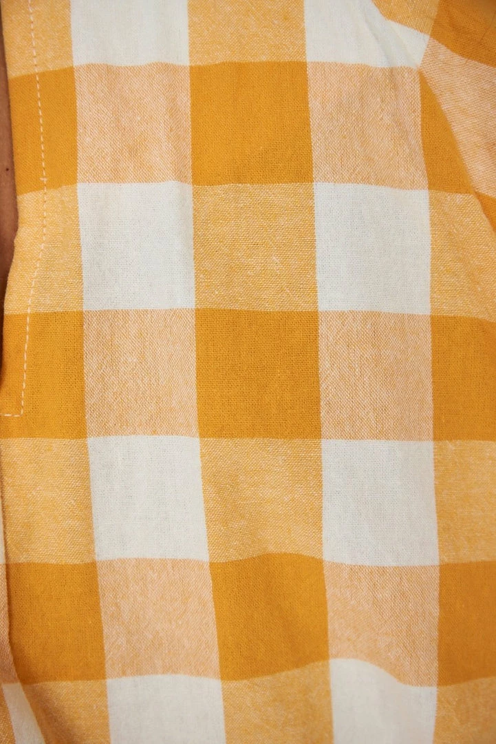 Our Josepha Top comes in a tangerine orange & white tone check print. It features a round neckline and short sleeves for a relaxed, comfortable fit. It pairs beautifully with jeans or a basic pants for a stunning spring seasonal look!