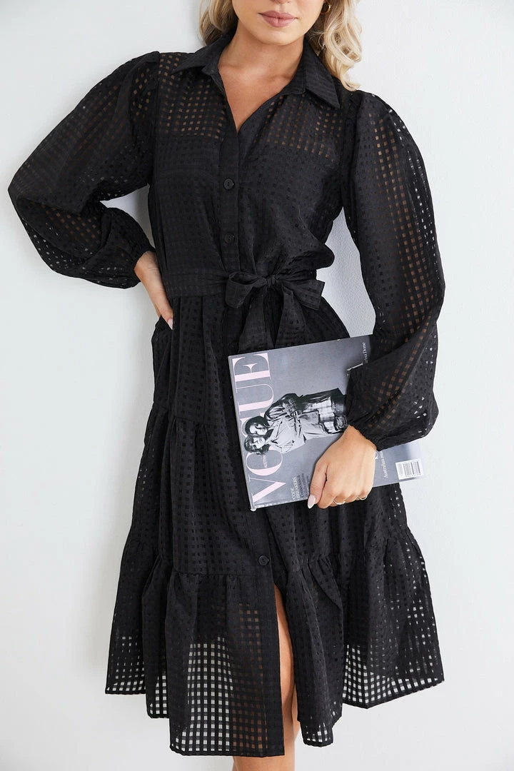 Our Notepad Dress comes in an elegant black tone color in a medium weight, relaxed fit midi length. The v neckline, classic collar, long sleeves, tiered skirt and buttons down the front are fab additions to this midi that you’re sure to love as the weather begins to cool.