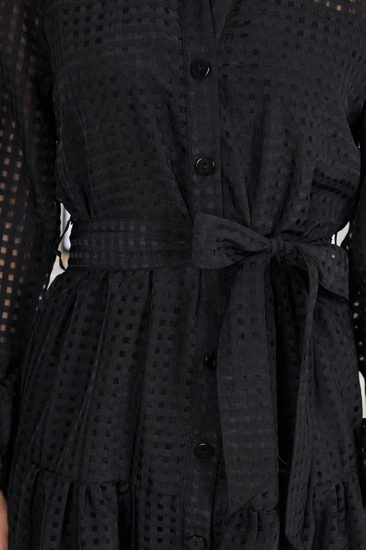 - Key Features: Classic Collar. Midi length. Long sleeves. Cinched Cuffs. V neckline. Puff sleeves. Fabric waist tie. Tiered skirt. Buttons down the front.