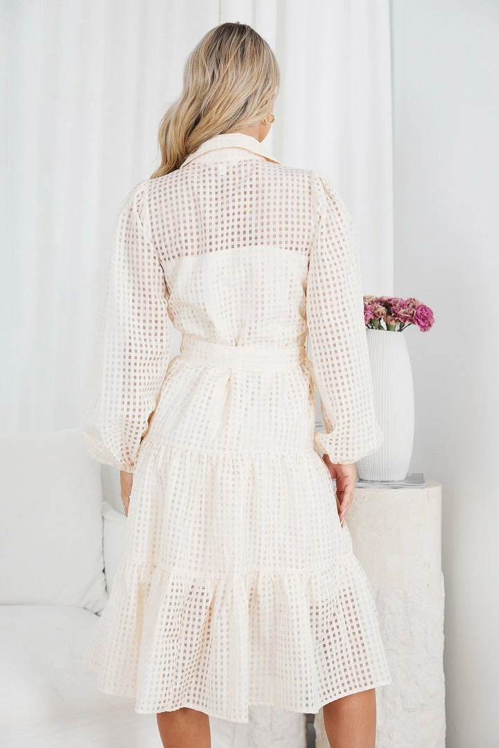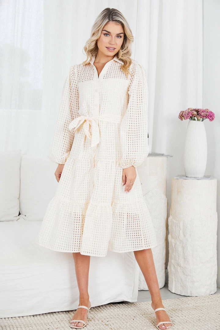 Our Notepad Dress comes in a gorgeous cream tone color in a medium weight, relaxed fit midi length. The v neckline, classic collar, long sleeves, tiered skirt and buttons down the front are fab additions to this midi that you’re sure to love as the weather begins to cool.