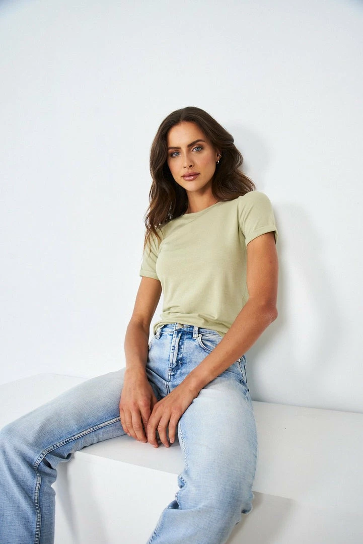 Our Primed Top is a khaki green tone. It is the sister of our bestselling Primary Top. It’s a gorgeous lightweight material, in a relaxed fit ideal for everyday wear. The classic tee silhouette pairs perfectly with all kinds of bottoms making this your next go-to item.
