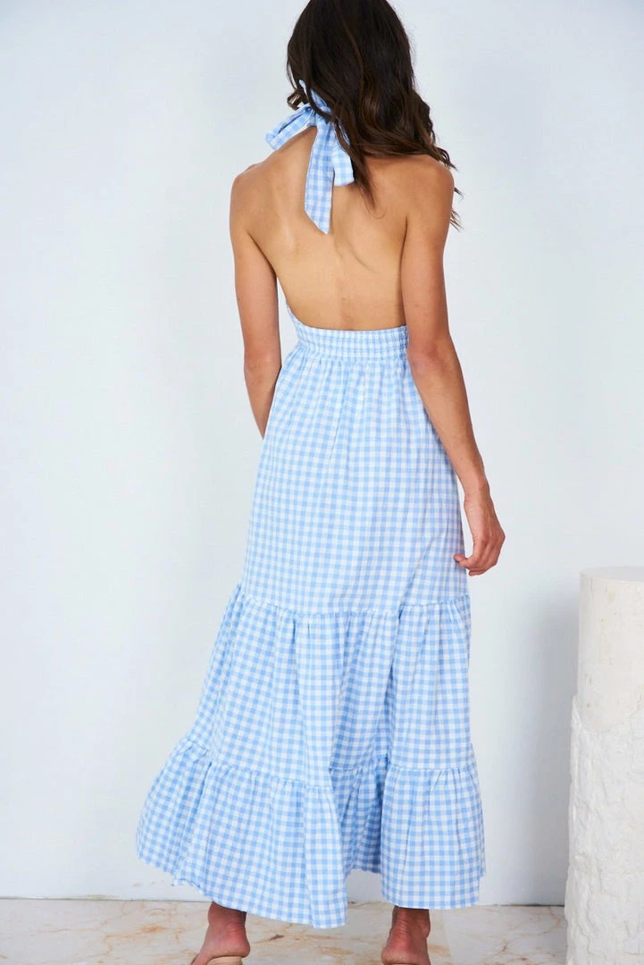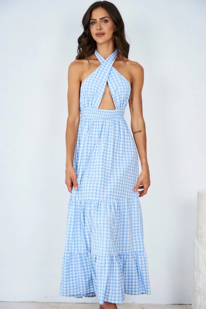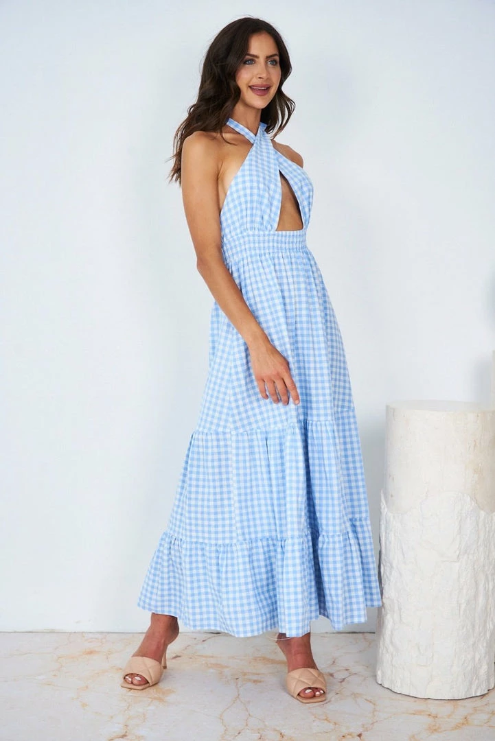 Our Marilene Dress comes in a blue & white tone gingham print. It’s a sleeveless midi that features a halter style neckline for a relaxed, comfortable fit. This flowy maxi pairs beautifully with heels for a fun, relaxed look this summer!