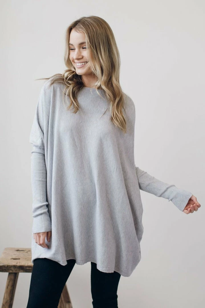 Our Tamia Knit is a lovely grey tone in an oversized drape fit. This top features boat neckline, batwing long fitted sleeves and a roomy fit making this ideal for growing baby bumps. Pair tucked into your fave denim and ankle boots for a cute off-duty look.