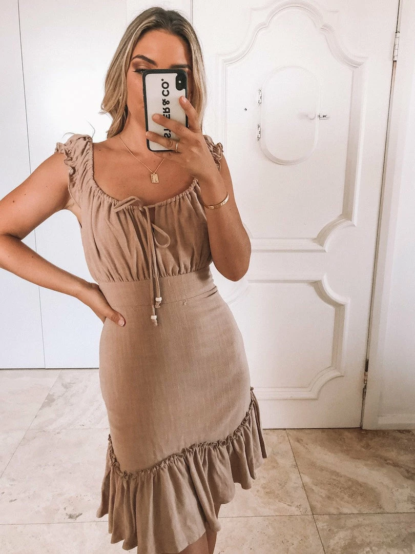 Our Montee Dress comes in a warm cozy faded tan tone. This relaxed mini features a square neckline with tie detailing, gathered detailing on the bust, frill detailing on the sleeves and hem. Pair with your favourite denim or leather jacket for a lovely autumn look!