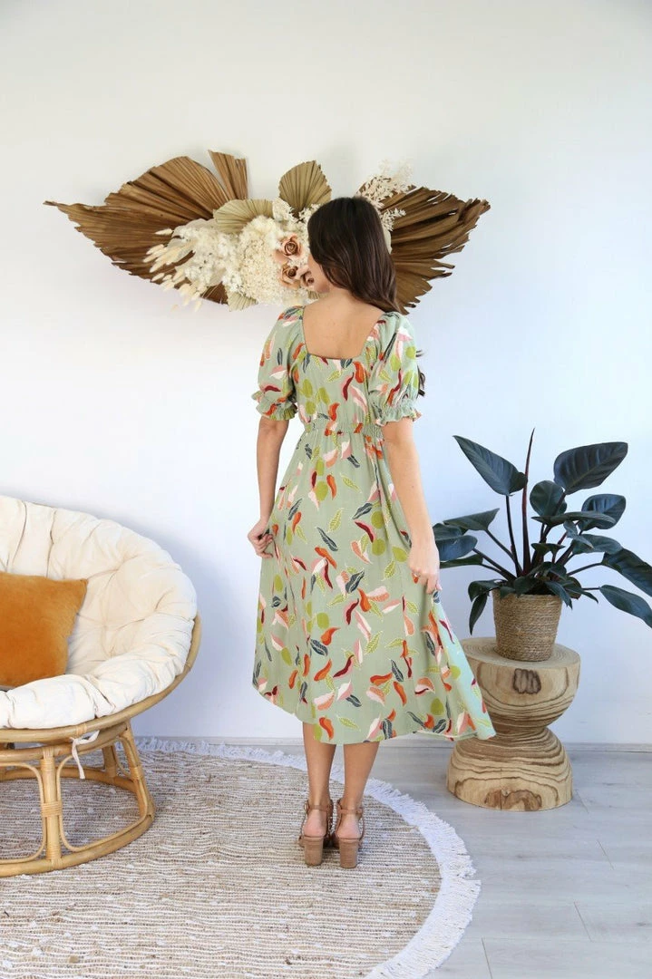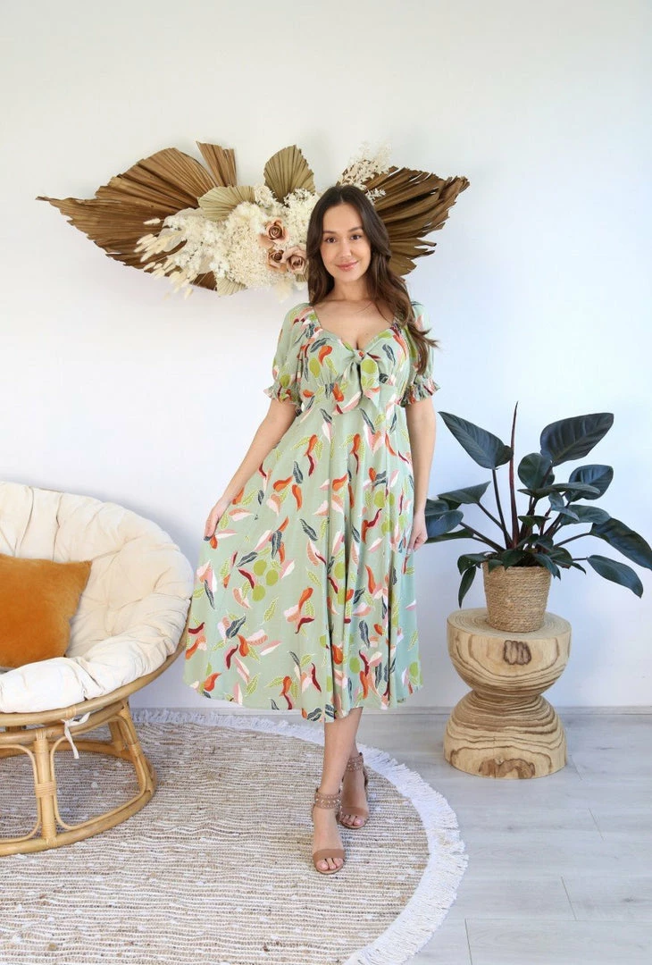 Our Danielle Dress comes in a sage tone base, with a red, green & blush tone print. It features a sweetheart neckline and short sleeves for a relaxed, comfortable fit. This flowy midi pairs beautifully with heels for a stunning spring look!