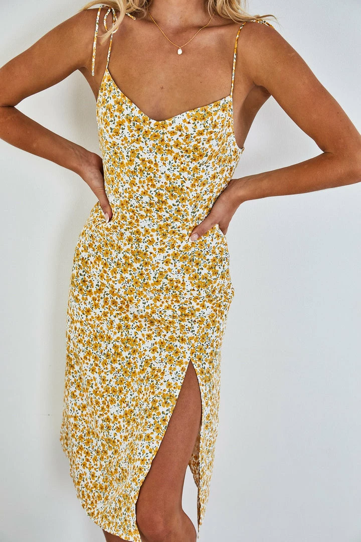 Our Cleo Dress is a white base with yellow, dark mocha & green micro floral print. This vibrant printed lightweight dress is sure to be your fav Spring occasion dress. This midi features a shirred elastic back for a comfortable fit whilst the sweetheart neckline is a feminine and gorgeous addition. The side split makes walking a breeze and the invisible zip at the back is an effortless feature of this lovely dress.