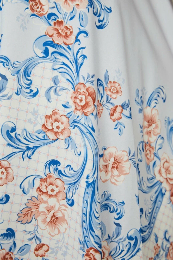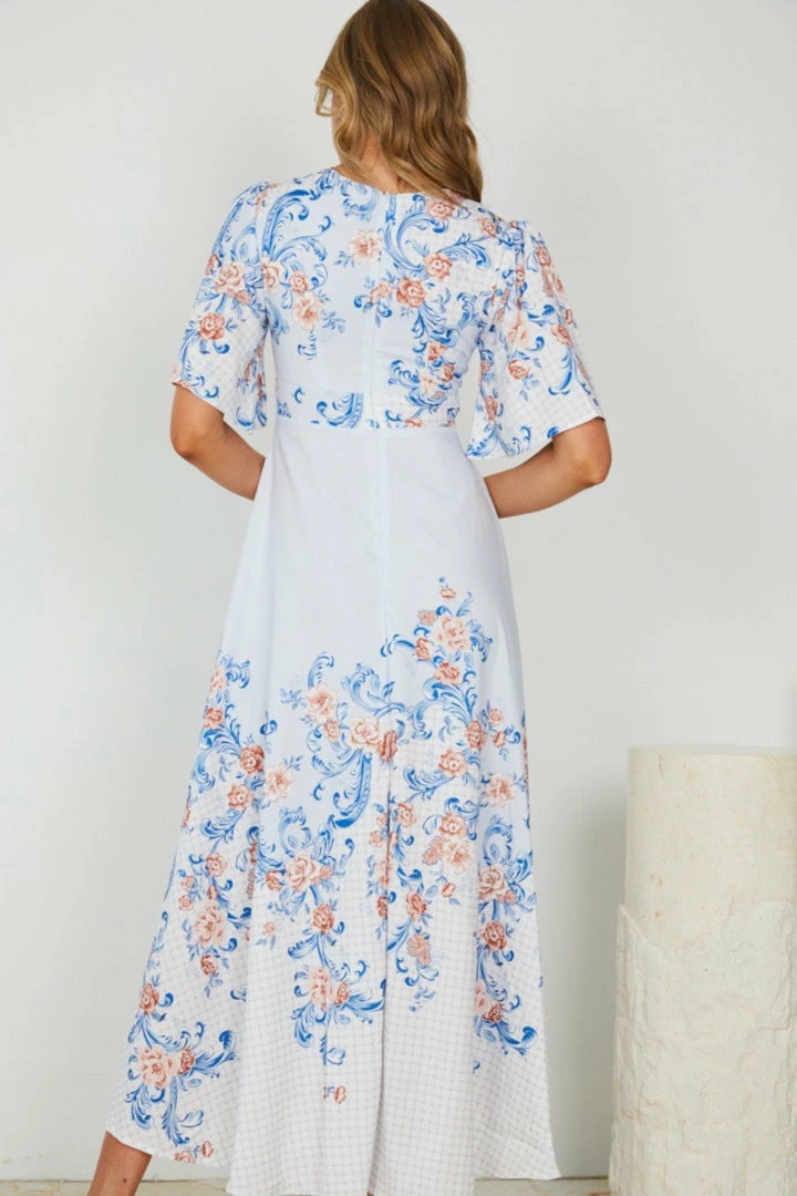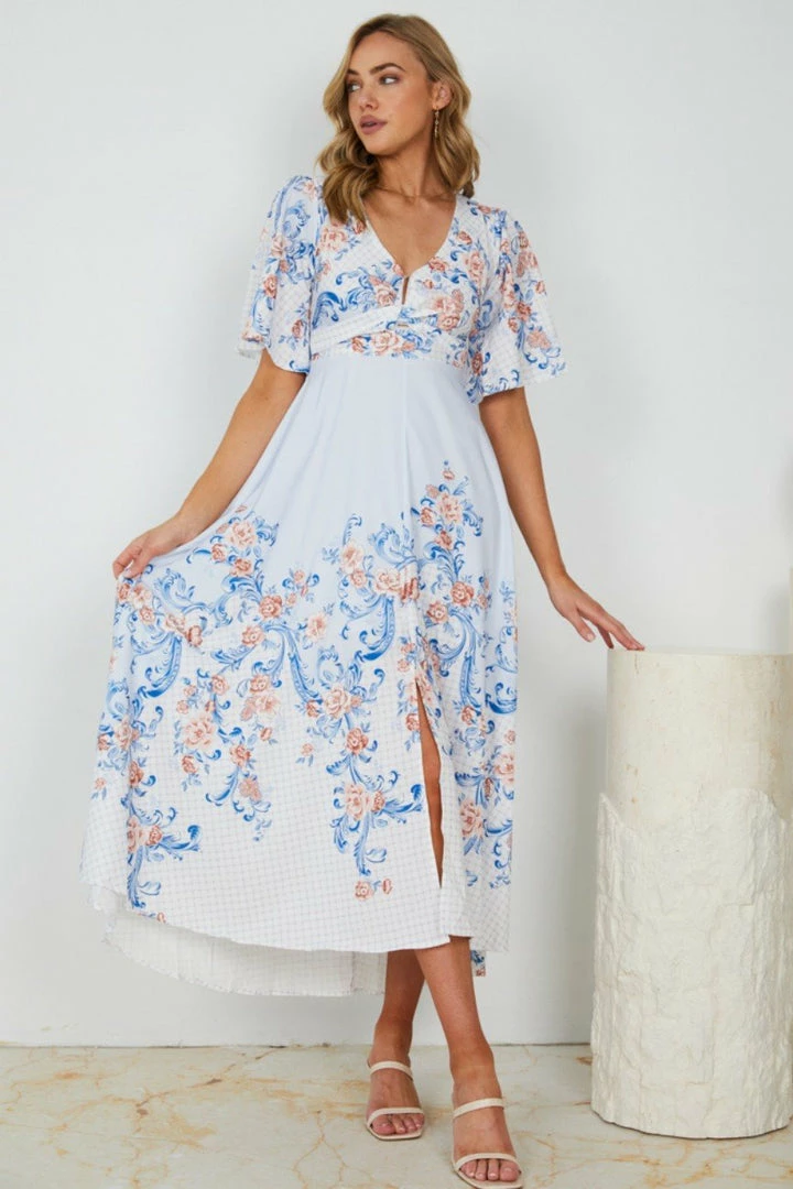 Our Sarmie Dress is a lovely light blue base with baby pink, tan, & floral print. This printed midi comes in a lightweight non-stretch fabrication that you’re sure to love. The gorgeous wrap style bust detail is a feminine touch. The skirt flows out making this ideal for a day out with the girls.