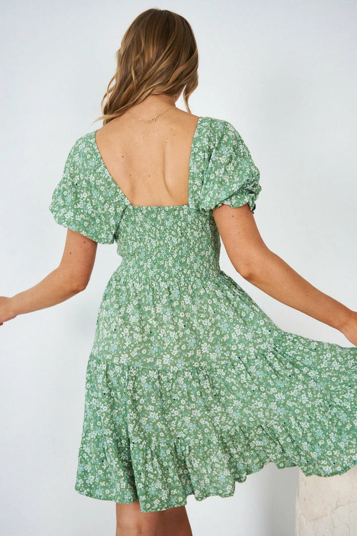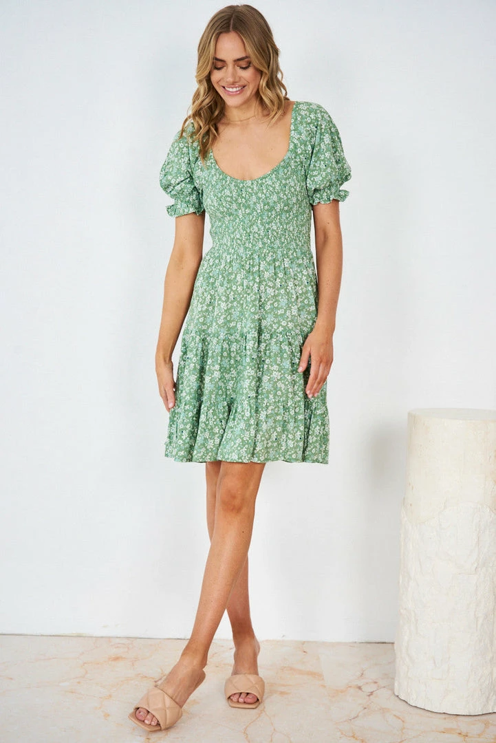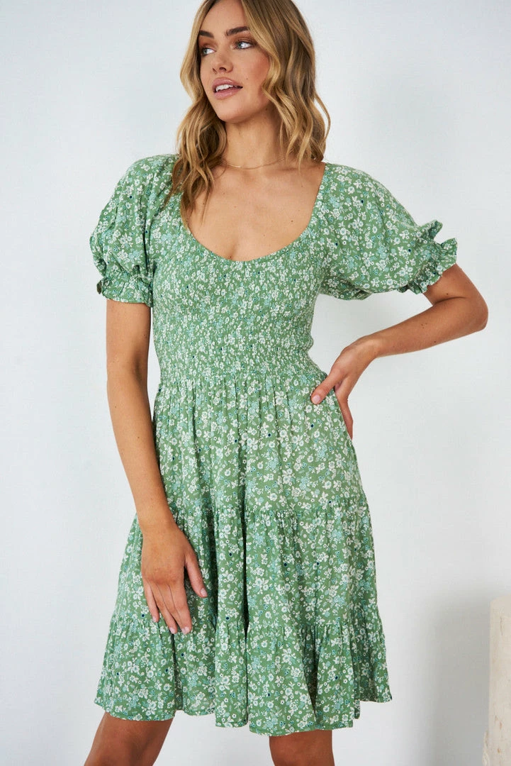 Our Geraldine Dress comes in a green tone base, with a white & light blue floral print. It features a round neckline, short sleeves, and a tiered skirt. This flowy midi pairs beautifully with heels for an effortless transseasonal look!