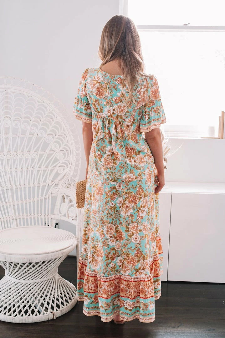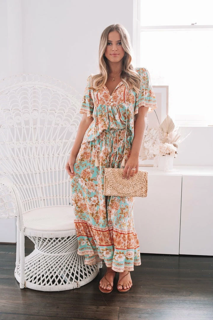 Our Marina Skirt is a vibrant turquoise base with pastel pink, peach, beige and orange toned floral print. It’s a gorgeous lightweight material in a relaxed boho style. The elastic waist features a drawstring that allows for comfortable customisability with a fun tassel detail. The skirt features a gorgeous frill detail on the hemline in a contrast print and a front split for effortless strolling. Pair with your fave ribbed crop during the Summer or a chunky cream knit during the winter.