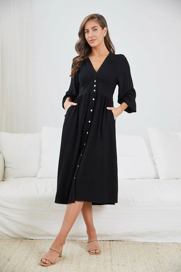 Our Nylia Dress comes in a classy black colour. Because fashion is the extension of the soul, let others get a glimpse of the ultrachic in you with this beautiful midi that features a deep v-neckline, long bishop sleeves, centre-front buttons, slight gathering on the shoulders & waist and flowy a-line skirt. Nude heels and classic accessories pair amazingly with this piece!
