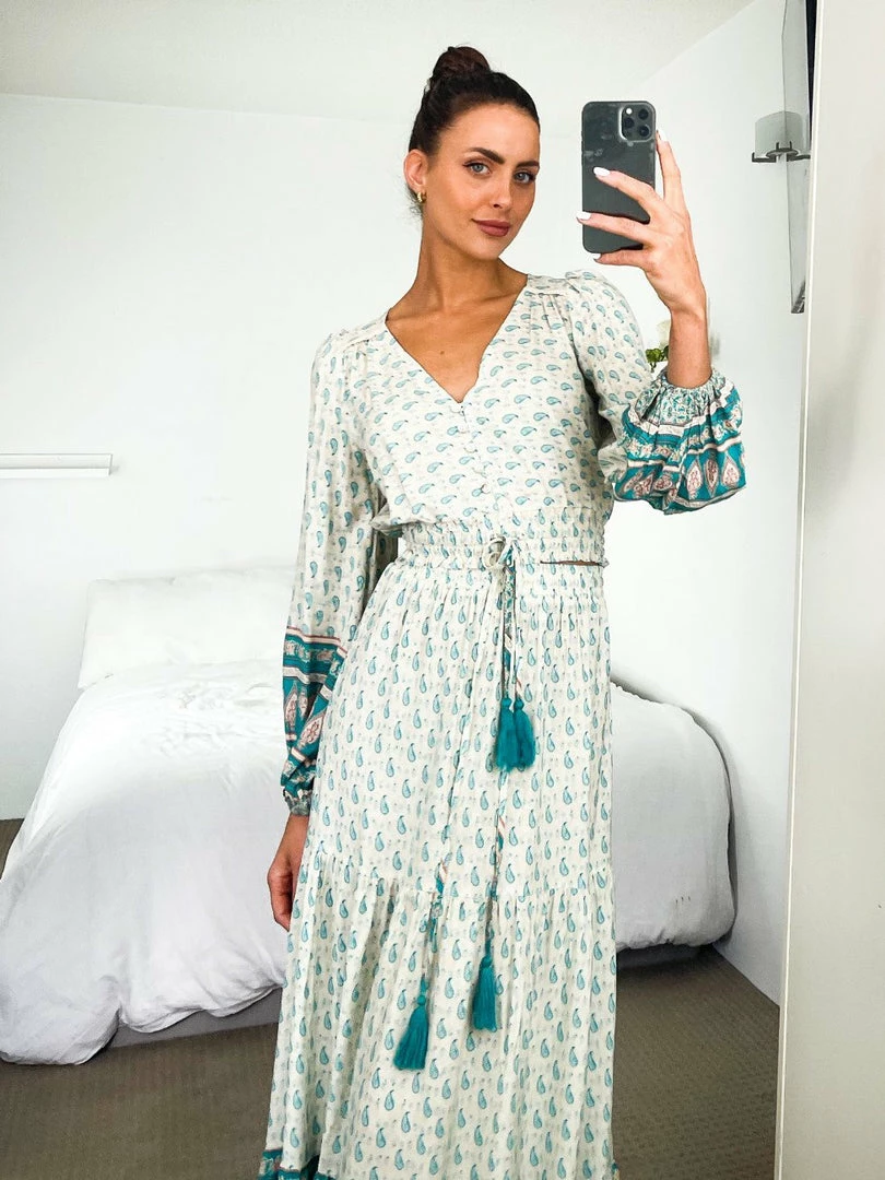 Our Riley Skirt comes in a faded green tone base, with a turquoise tone print. It features a maxi length and an elasticated waistband with drawstring for a relaxed, comfortable fit. This skirt pairs perfectly with a basic top for a relaxed seasonal look!