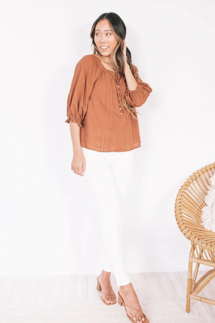 Our Elke Top comes in a light chocolate tone in a lightweight fabric. It features a keyhold neckline, button detailing on the front, and 3/4 sleeves cinched at the cuff for a comfortable fit. This top pairs beautifully with a skirt or pants for a classy evening look!