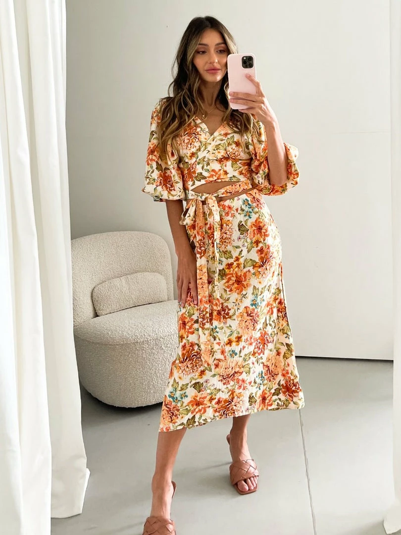 Our Lilypad Skirt comes in a gorgeous off-white base with red, light turquoise, peach, olive, orange & brown-toned floral print. This midi skirt is a classic straight fit. She pairs beautifully with the Lilypad Top and gold accessories.