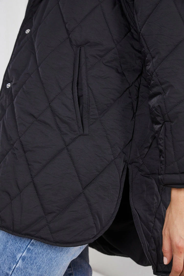 - Key Features: Long sleeves. Side pockets. Functional buttons on front sides. Silver click closures (button) on front of garment (buttons are black on front). Hood on back. Quilted design. Cut on side hemlines. No stretch.