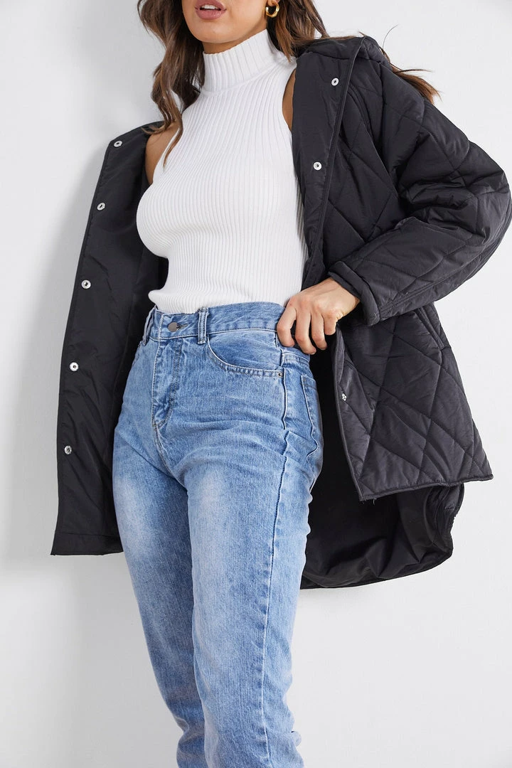 Our Fakey Jacket comes in a sophisticated black colour. A winter wardrobe homerun, this long sleeved outerwear is surely a winner in protecting you from the cold season ahead. It features a quilted detailing on the fabric, snap button closure, side diagonal welt pockets and a hood on the back that pair well with stylish combat boots!