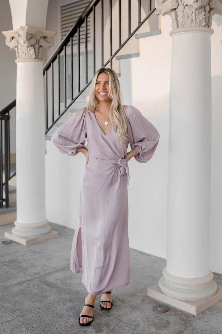Our Heather Dress is a pink blush tone. It’s a gorgeous lightweight material in a flattering & relaxed silhouette. The v neckline, bishop 3/4 sleeves & tie on waist detailing are feminine additions to this classy dress.