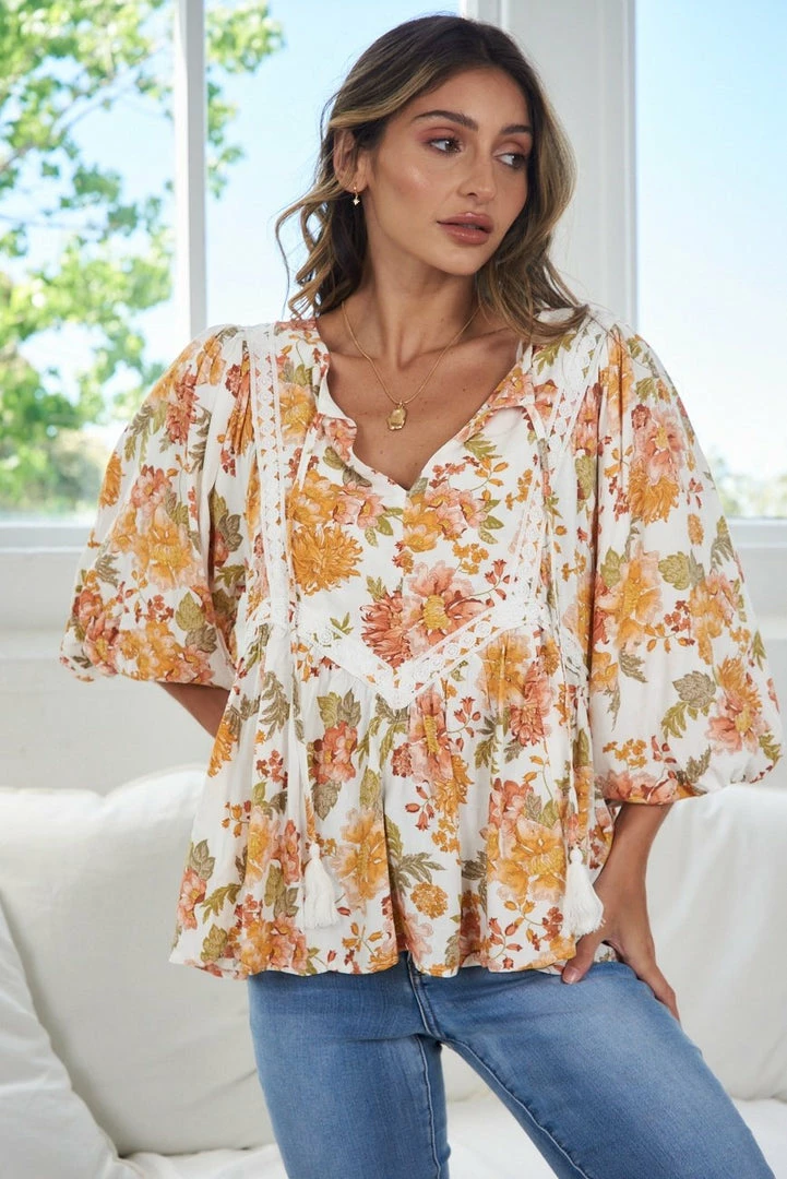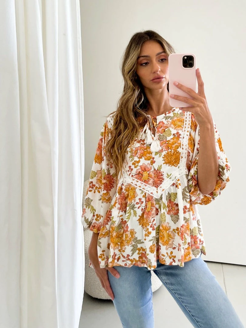 Our Peni Top is a white base with vibrant orange, green, yellow and red toned floral print. This lightweight and relaxed fit top features 3/4 sleeves and v neckline with tie. She pairs beautifully with your fave blue denim shorts and white sneakers.