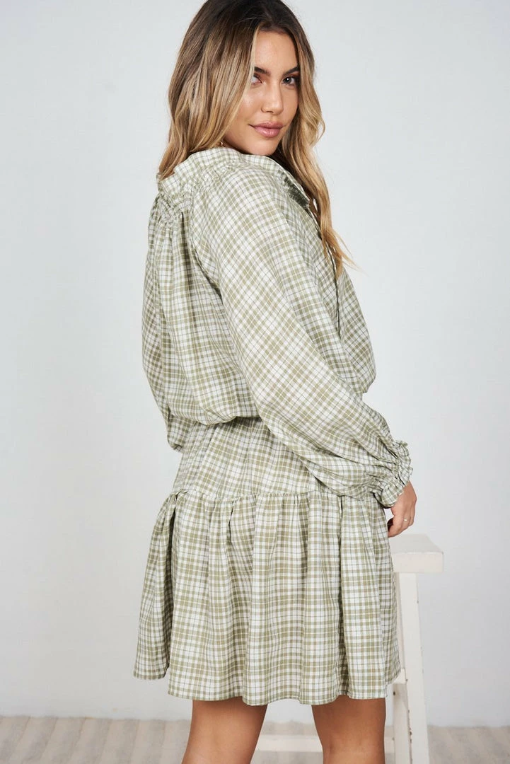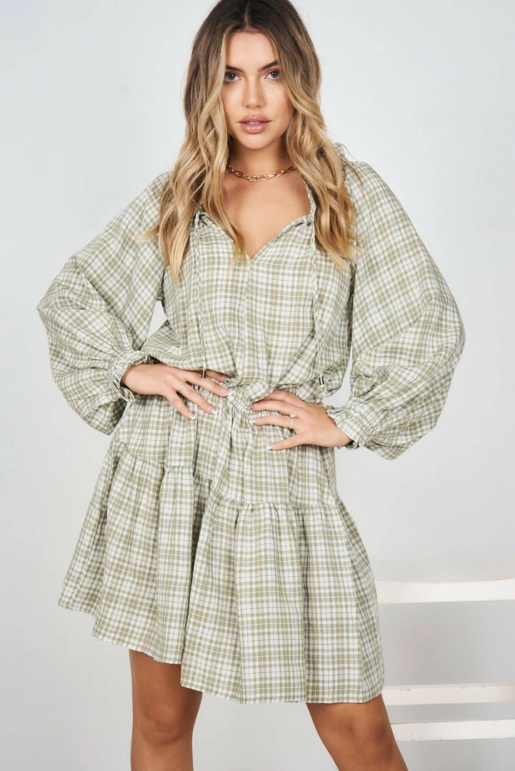 Our Peggie Dress comes in a khaki green & white tone print. It features a v neckline, long bishop sleeves, and a tiered skirt. This flowy mini pairs beautifully with heels or boots for an effortless transseasonal look!