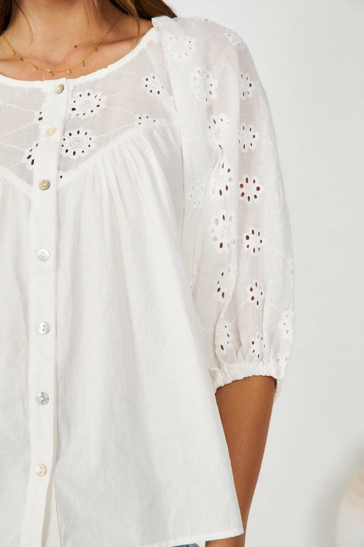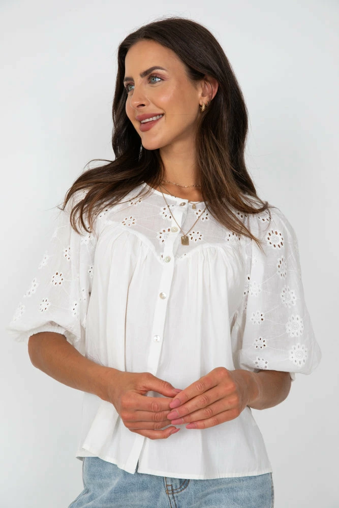 Our Yuka Top is a classic white tone. It’s a gorgeous medium-weight cotton material, the sleeves are graced with crochet detailing making this a gorgeous boho style. It features a round neck and buttons down the front of the garment. You can pair this lovely top with your favorite skirt and heels for a sophisticated spring look!