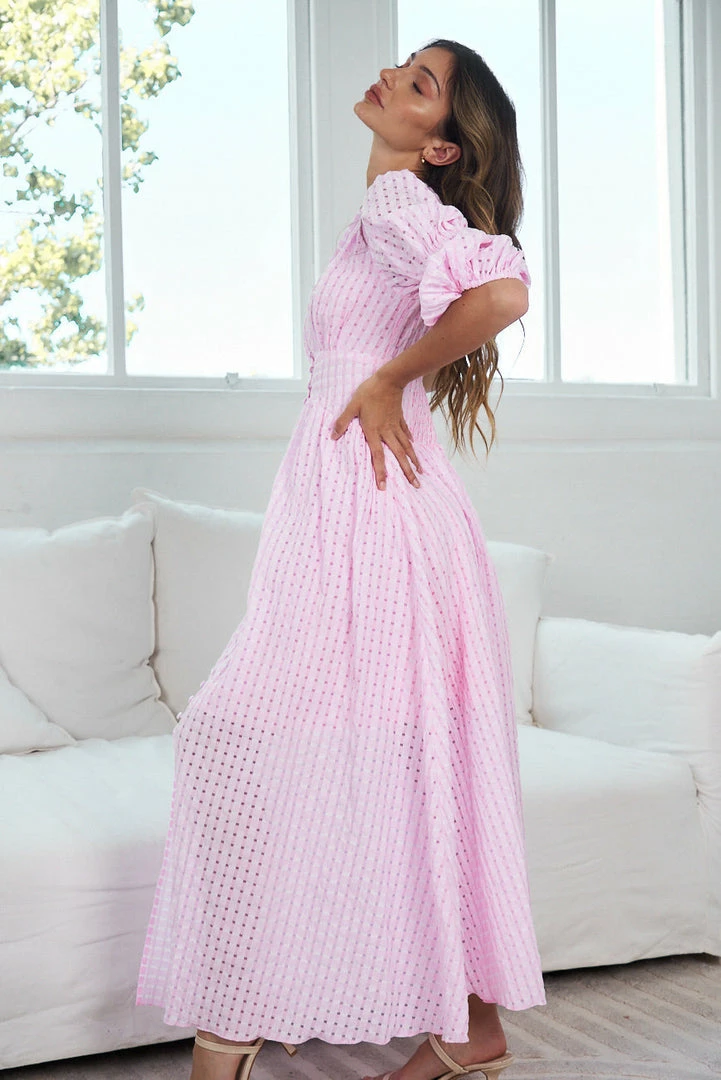 Our Charis Dress comes in soft pink tone. It features a v neckline, short sleeves, and button detailing down the front. This flowy midi pairs beautifully with heels for an effortless transseason