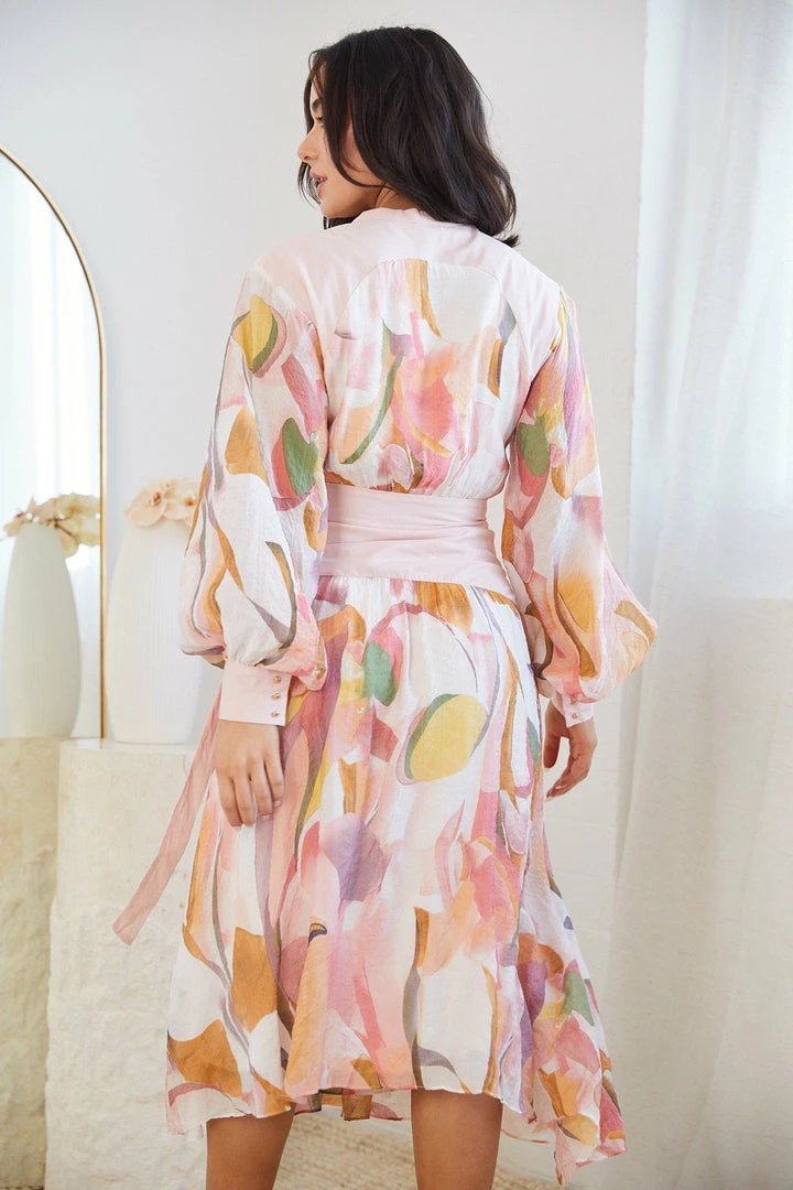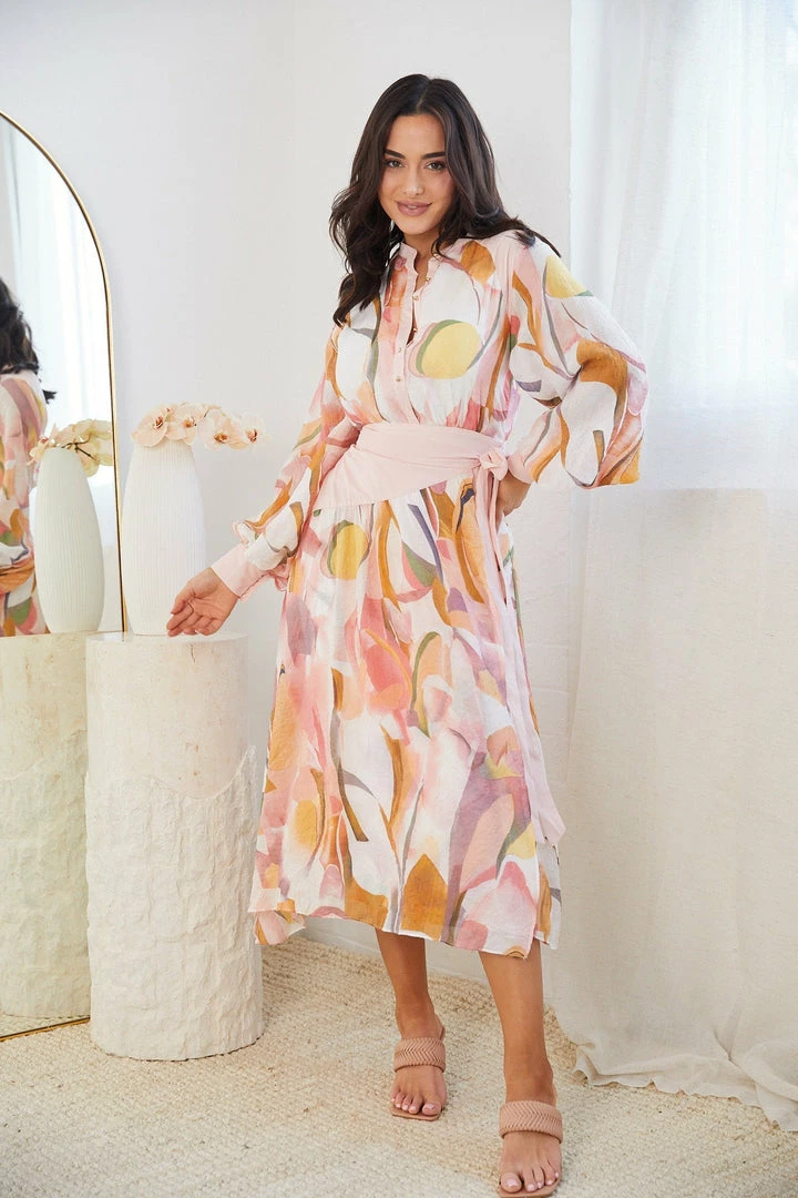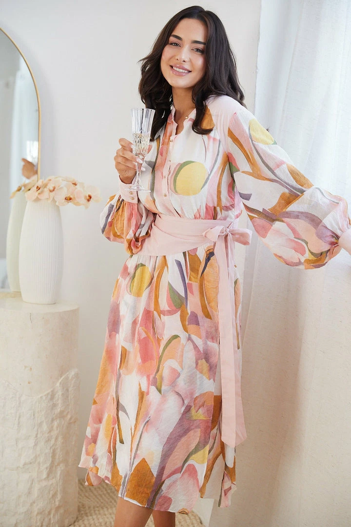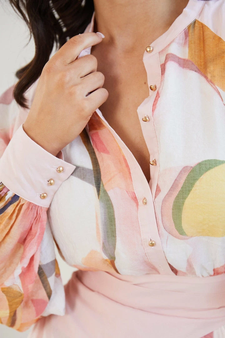 Our Delfinia Dress comes in a solid blush pink tone with multicoloured prints. Bringing out an extra spark for a beautiful woman like you, this midi is designed with a mandarin collar, centre-front buttons, long cuffed sleeves, asymmetrical hem and waist tie. Style it with marmalade hued heels and pearl earrings!