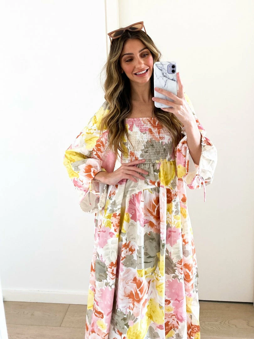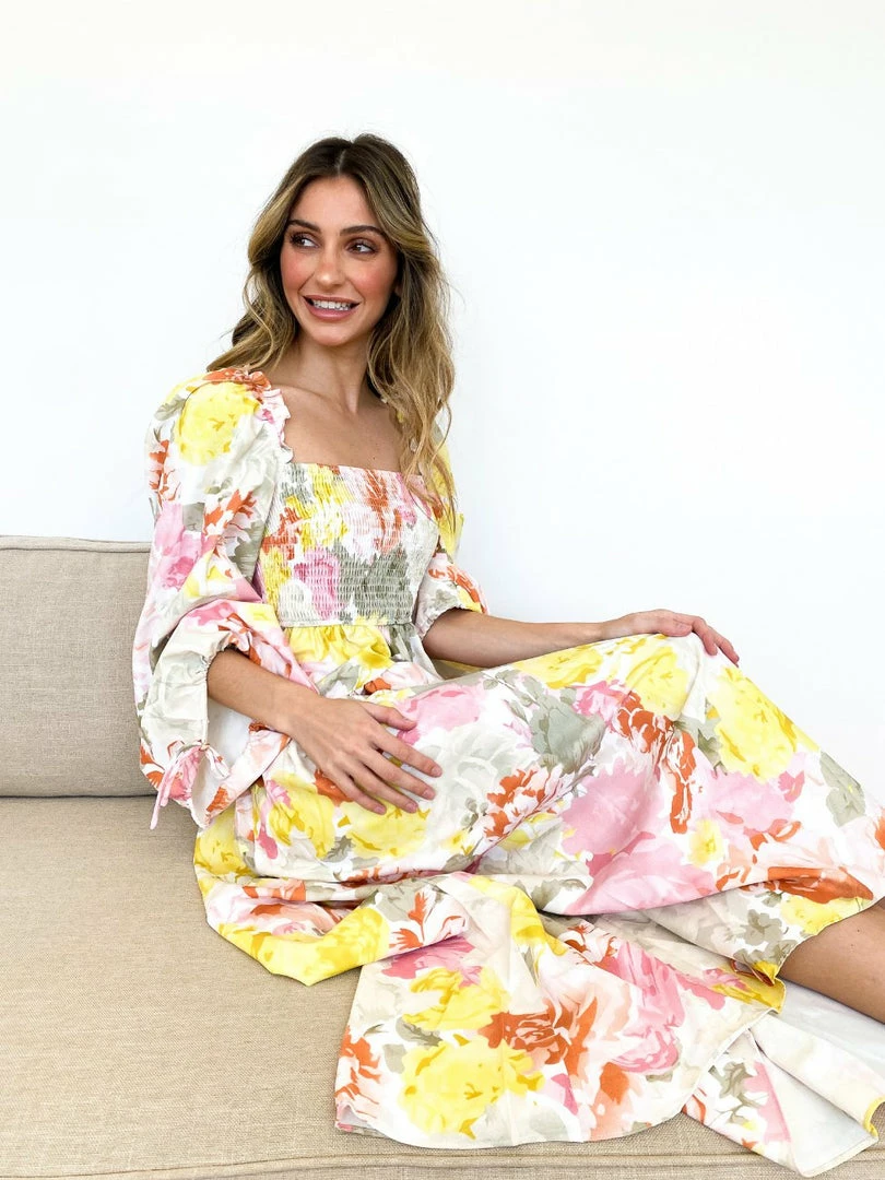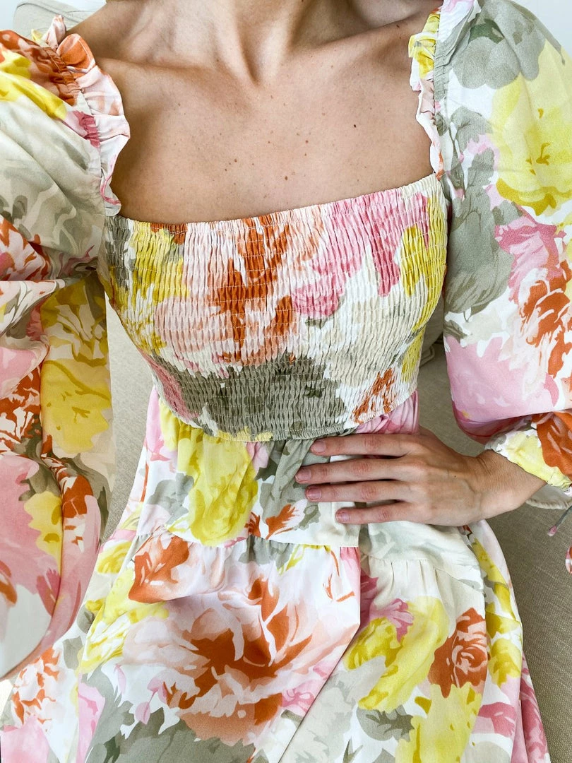 Our Betony Dress comes in a rust, yellow, sage & white tone floral print. It features a square neckline, long relaxed sleeves, and a textured pattern on the bodice. This flowy midi pairs beautifully with heels for a stunning look this spring season!