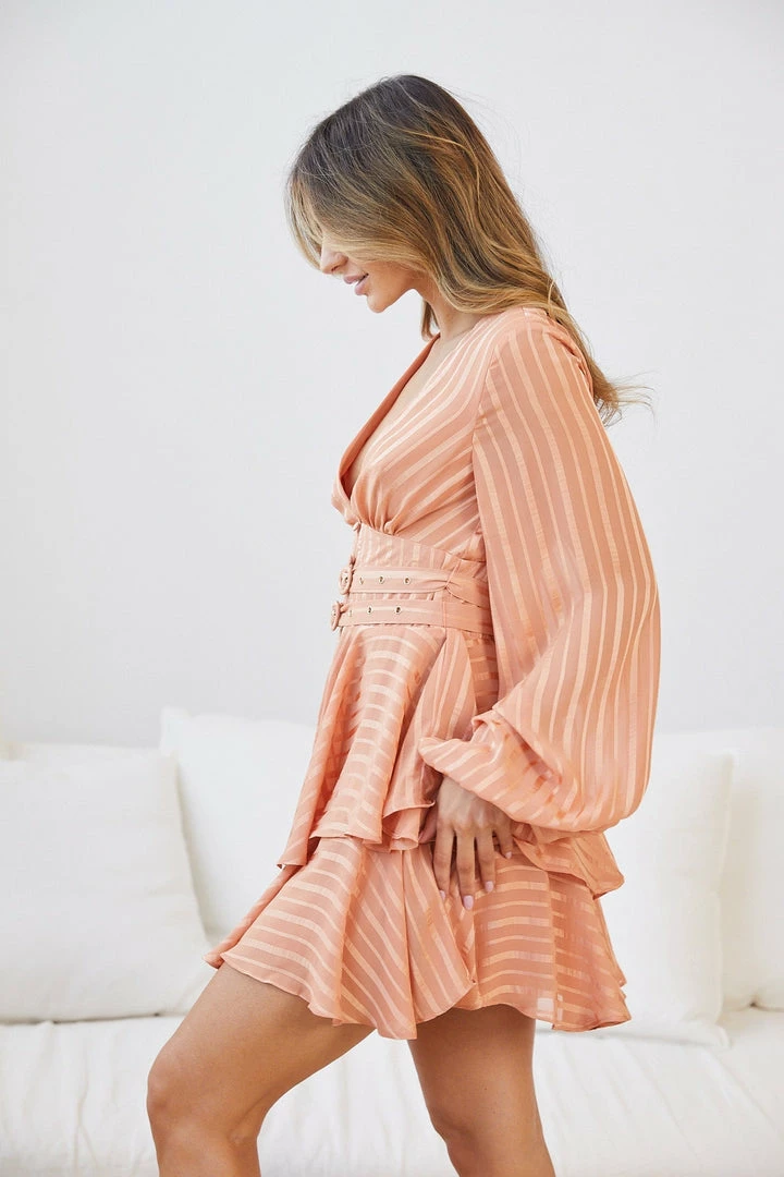 Our Birkley Dress comes in a rust-brown tone. Sizzle in this sexy mini that features a plunging neckline, long bishop sleeves, layered skirt, button detailing on front and double belt style on waist. Make a remarkable entrance in nude stilettos and a string necklace!