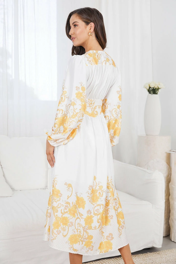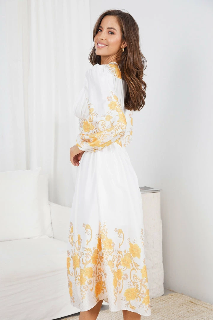 Our Nicolene Dress comes in a fresh white base and vibrant yellow floral prints. Like a queen, feel like you’re wearing your crown of beauty in this exquisite maxi that features a plunging neckline, long bishop sleeves, a-line skirt and a cut on the waist flattering your shape. The print designs add a classy finish and can be beautifully paired with a matinee crystal necklace.