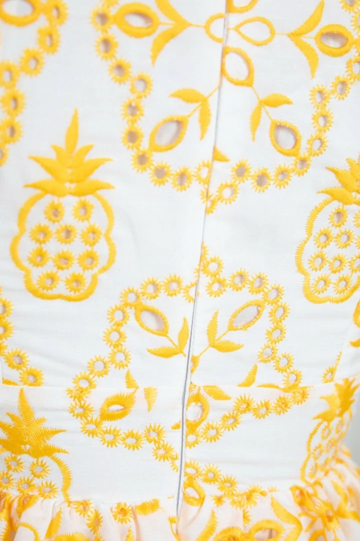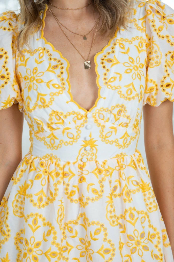 Our Pania Dress comes in a white base with yellow embroidered prints. This features an artistic sweetheart neckline, short puff sleeves, and gathered fabric under the bust and from the waist down. This feminine mini is beautifully vibrant and wears like a fantasy!