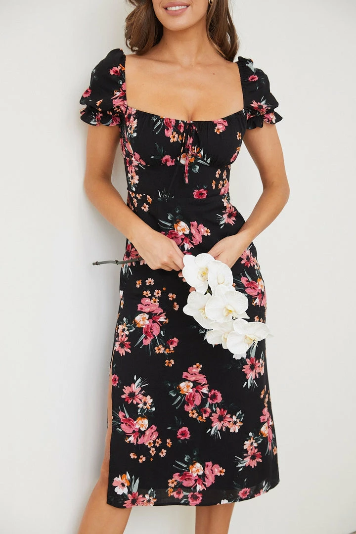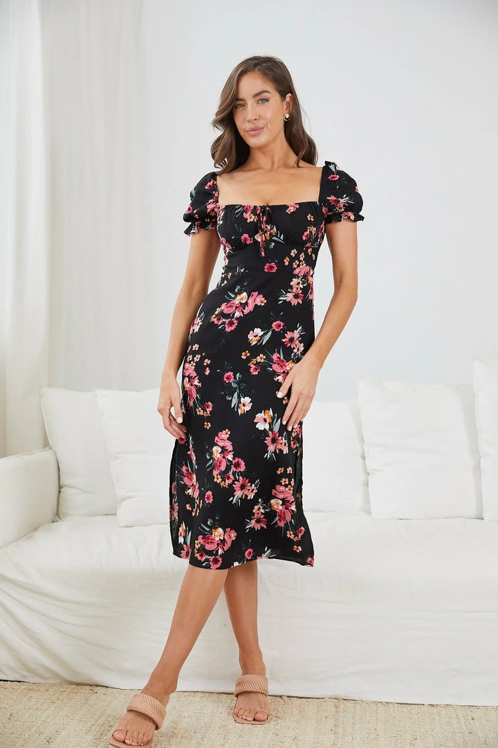 Our Idalia Dress comes in a beautiful black base with multicoloured floral prints. As if you’re far away from the blaring noise of the city, let this midi take you to a tranquil place with its serene shape and detailing. The square neckline with string, subtle puff sleeves with frills, gathering on bust and straight skirt make this a gentle staple that delightfully pairs with pink heels!