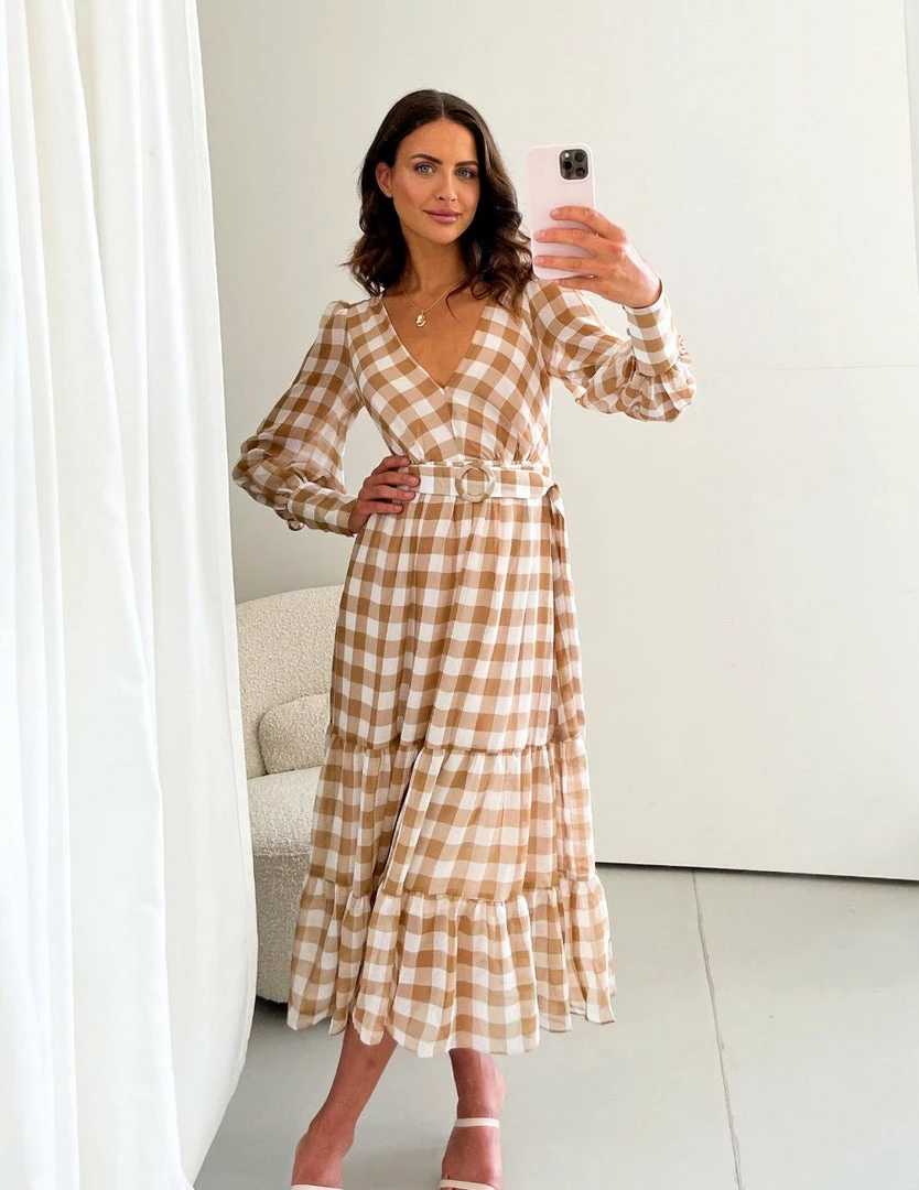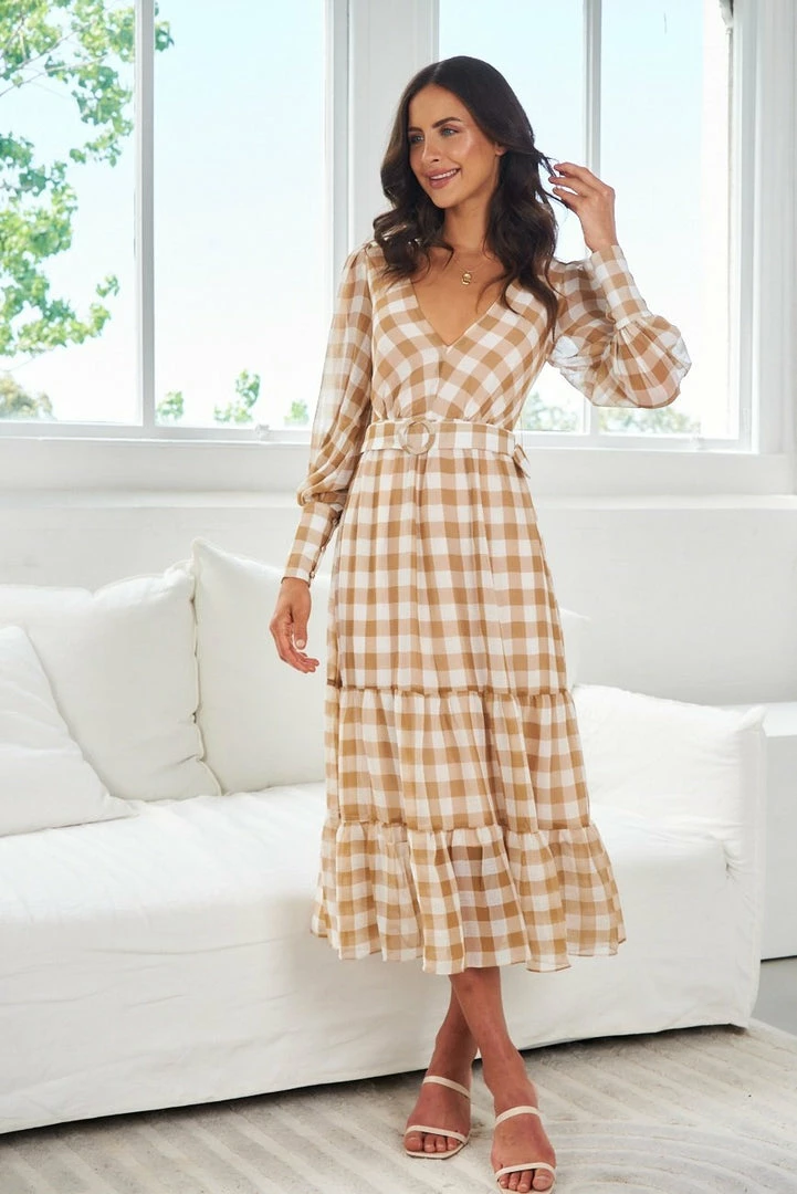 Our Jaida Dress comes in a beige and white tone gingham print. It features a v neckline, long bishop sleeves cinched at the cuff, and a fabric belt to cinch in the figure beautifully. This flowy midi is the perfect seasonal dress!