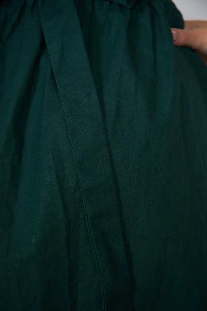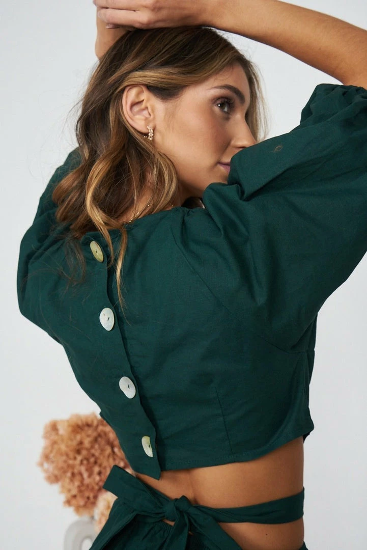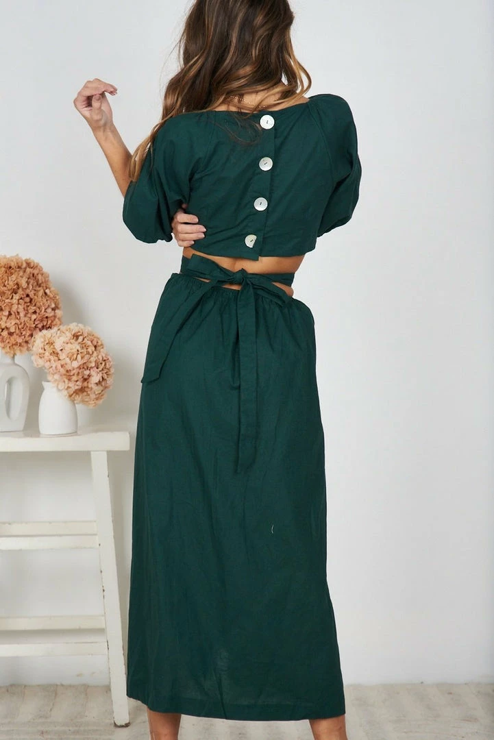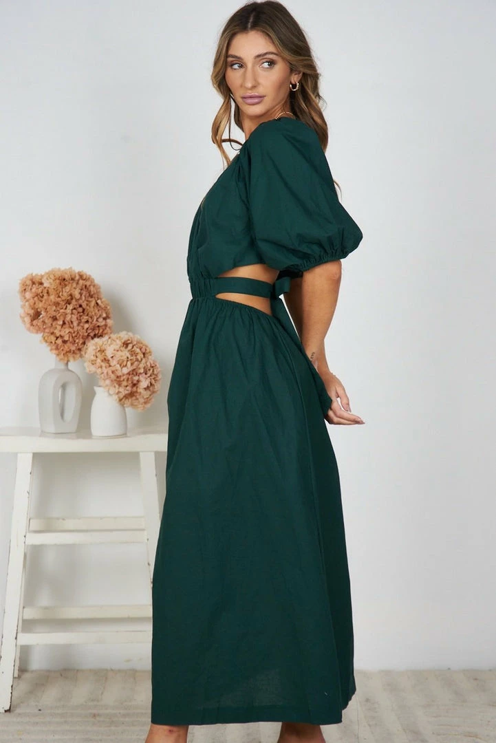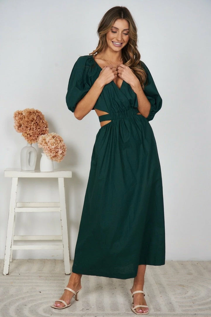 Our Paulene Dress comes in a emerald green tone. It features a plunging v neckline, short sleeves, and side cutouts at the waist. This flowy midi pairs beautifully with heels for an effortless transseasonal look!