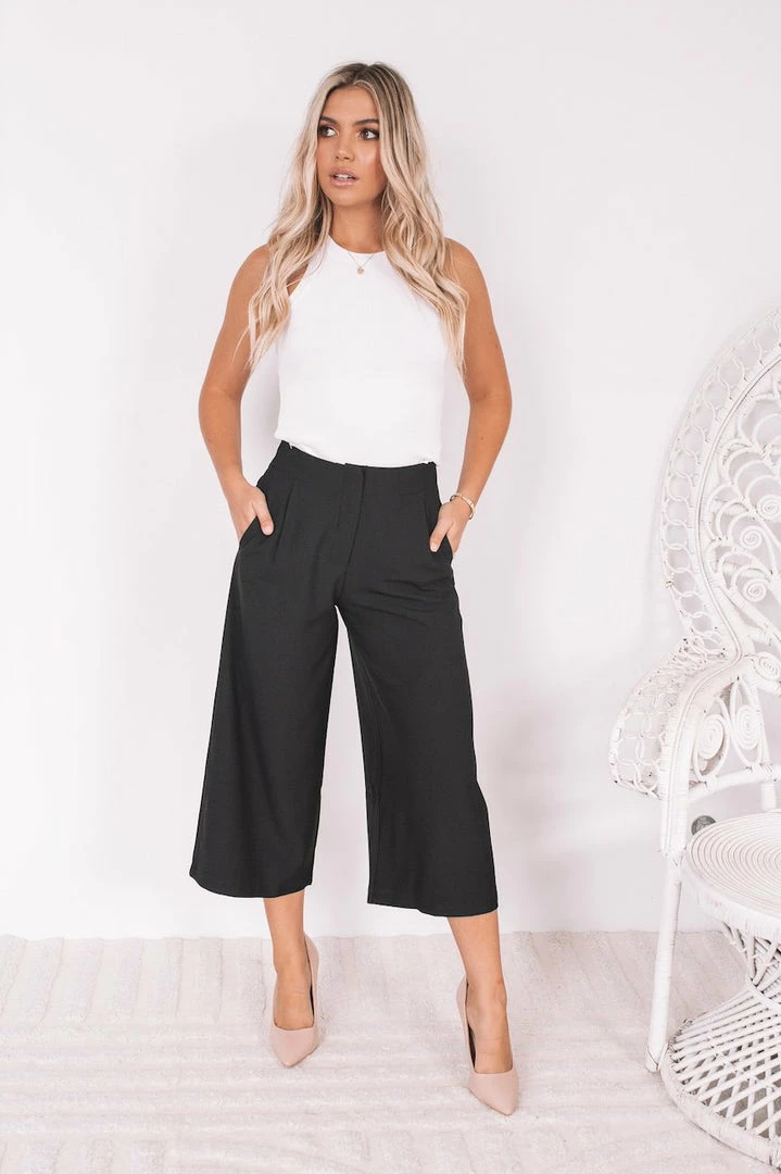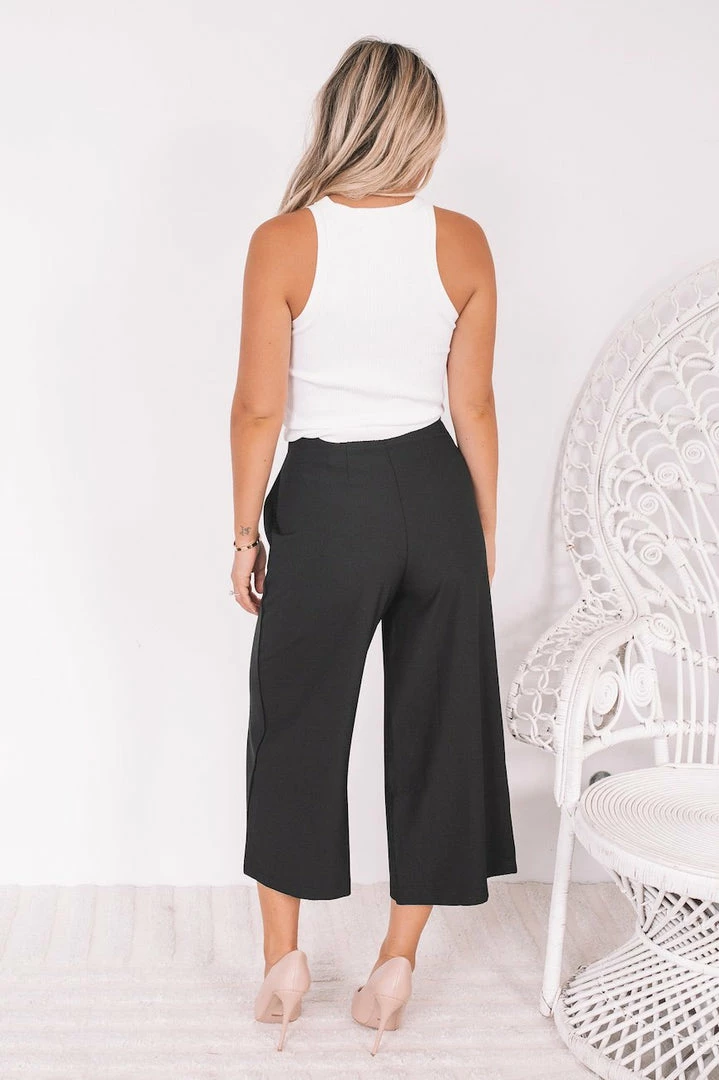 Our Back It Pants come in a classic black tone. These relaxed high waisted culotte pants feature darts at the front, zipper on the front centre, pockets, and a wide-leg silhouette. These classy pants are perfect for the office and can be dressed up for drinks after work.