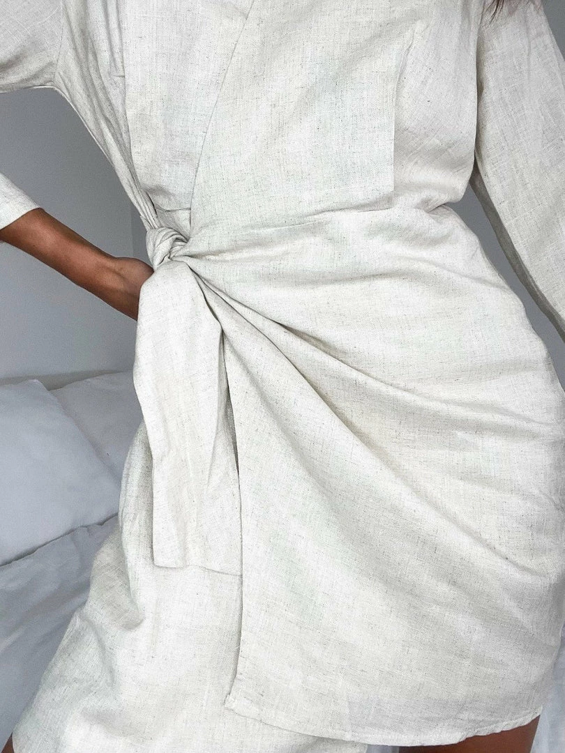 Our Dalya Dress comes in a sand-beige tone. It features a traditional collar, v neckline, long relaxed sleeves, and a fabric waist tie to bring the dress together. This relaxed mini pairs beautifully with heels for an elegant, casual, look!